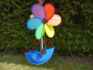 One of a kind - this windmill device can be hung or placed up high on your garden fence and oh! What a lot of bubbles! The wind turns the windmill which is linked to a pulley system that turns the 8 beaded wands around the trough.